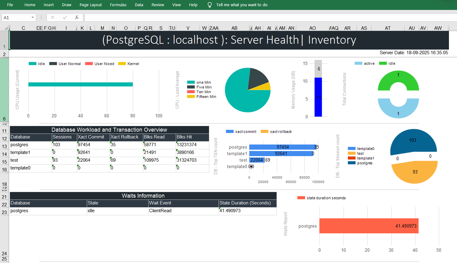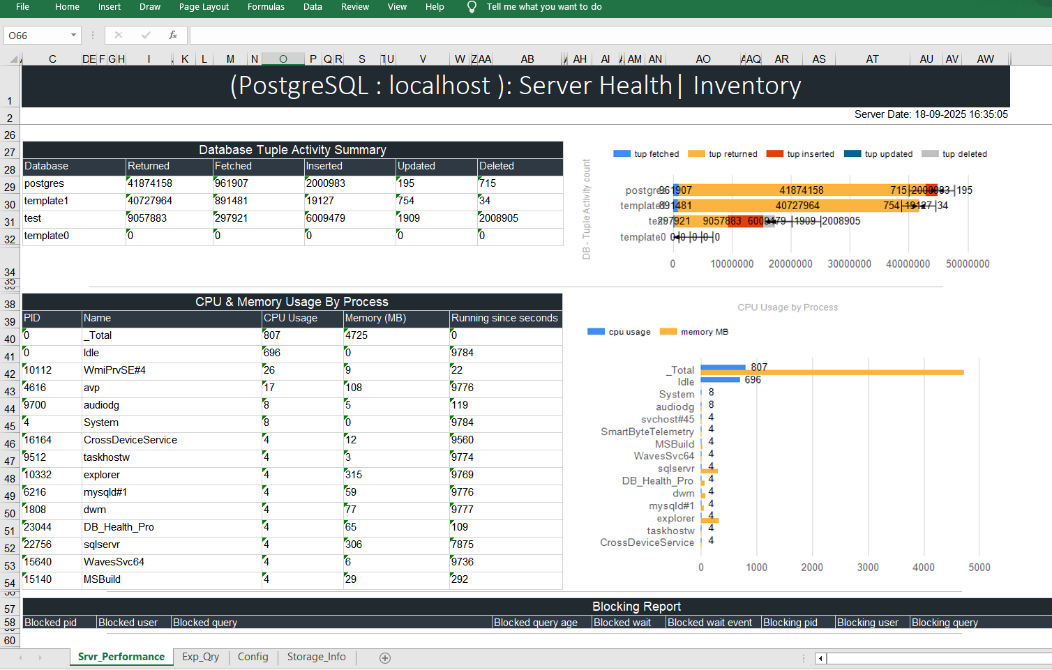 - Server Performance Report (CPU, Memory , Connections, workload, Waits Report, Database Tuple Activity , etc.)